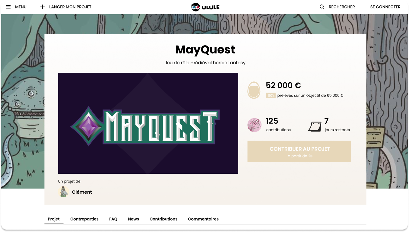 MayQuest étant un projet "entrepreneurial", il était nécessaire de prévoir un budget et de préparer une campagne de crowdfunding pour pouvoir réaliser ce jeu. Tout le template de la campagne a été réfléchi et élaboré et le jeu aurait théoriquement pu être lancé en face de financement.